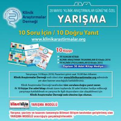 Klinik Araştırmalar Derneği tarafından 20 Mayıs "Klinik Araştırmalar Günü" münasebetiyle 10 soruluk bir yarışma düzenlenecektir.
