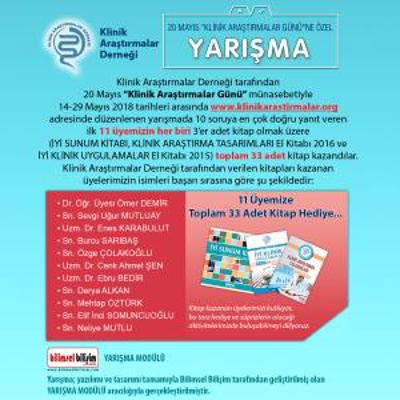 Klinik Araştırmalar Derneği tarafından 20 Mayıs "Klinik Araştırmalar Günü" münasebetiyle 14-29 Mayıs 2018 tarihleri arasında www.klinikarastirmalar.org adresinde düzenlenen yarışmada 10 soruya en çok doğru yanıt veren ilk 11 üyemizin her biri 3'er adet kitap olmak üzere (İYİ SUNUM KİTABI, KLİNİK ARAŞTIRMA TASARIMLARI El Kitabı 2016 ve İYİ KLİNİK UYGULAMALAR El Kitabı 2015) toplam 33 adet kitap kazandılar. Klinik Araştırmalar Derneği tarafından verilen kitapları kazanan üyelerimizin isimleri başarı sırasına göre şu şekildedir: