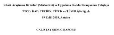 Türkiye’de Klinik Araştırma Birim yapılanması ve işlevselliğini değerlendirmek, Klinik Araştırma Birimi yapısına ek olarak Klinik Araştırma Koordinasyon Merkezi ve Klinik Araştırma Mükemmeliyet Merkezi yapıları göz önüne alınarak klinik araştırma süreçlerindeki minimum gereksinimleri ve işleyiş esaslarını belirlemek amacıyla, 19 Eylül 2018 tarihinde, Antalya’da Türk Tıbbi Onkoloji Derneği, Klinik Araştırmalar Derneği, Dokuz Eylül Üniversitesi Ulusal Klinik Araştırma Altyapı Ağı Uygulama ve Araştırma Merkezi, T.C. Sağlık Bakanlığı Türkiye İlaç ve Tıbbi Cihaz Kurumu ve Türkiye Sağlık Enstitüleri Başkanlığı iş birliğiyle "Klinik Araştırma Birimleri (Merkezleri) ve Uygulama Standardizasyonları Çalıştayı” düzenlenmiştir. Çalıştay klinik araştırma taraflarının temsilcilerinden oluşan 45 kişinin katılımı ile gerçekleştirildi. Çalıştay programında belirlenmiş olan üç çalışma grubu Klinik Araştırma Birimi, Klinik Araştırma Koordinasyon Merkezi ve Klinik Araştırma Mükemmeliyet Merkezi yapılarını tanımlayarak bu yapıların "klinik araştırmanın proje yönetimi", "Etik Kurul ve TİTCK başvuru süreci, monitoring, farmakovijilans”, "araştırma ürünü, biyolojik örnek ve veri yönetimi” ve “idari yapılanma” süreçlerindeki işleyiş esaslarını ve minimum gereksinimlerini daha önceden hazırlanmış olan kontrol listeleri üzerinden tartışmıştır. Grup çalışması sonucunda, çalışma grubu temsilcilerinin yaptıkları sunumlar doğrultusunda klinik araştırma süreçleri ve klinik araştırma birimi yapıları temel alınarak elde edilen çıktılar raporda açıklanmıştır.