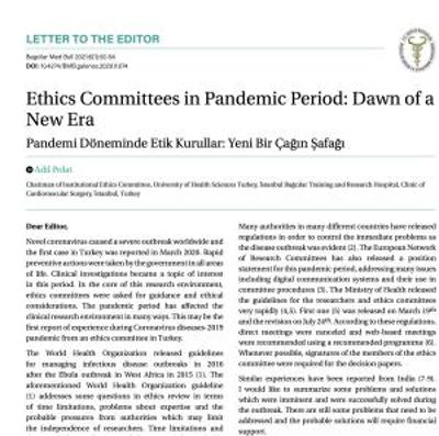 Konu ile ilgili yazı "Ethics Committees in Pandemic Period: Dawn of a New Era" başlığı ile Bagcilar Med Bull 2021;6(1):92-94 sayısında yayınlandı.