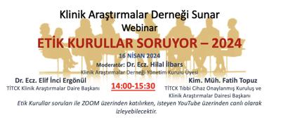 Webinarı Klinik Araştırmalar Derneği Yönetim Kurulu Üyesi Dr. Ecz. Hilal İlbars yönetecek. S.B. TİTCK Klinik Araştırmalar Daire Başkanı Dr. Ecz. Elif İnci Ergönül ve TİTCK Tıbbi Cihaz Onaylanmış Kuruluş ve Klinik Araştırmalar Dairesi Başkanı Kim. Müh. Fatih Topuz Etik Kurullardan gelen sorular için karşınızda olacak. Zoom bağlantısı üzerinde Etik Kurul üyeleri sorularını sorarken, YouTube canlı yayınımızla isteyenler webinarı izleyebilecekler.
