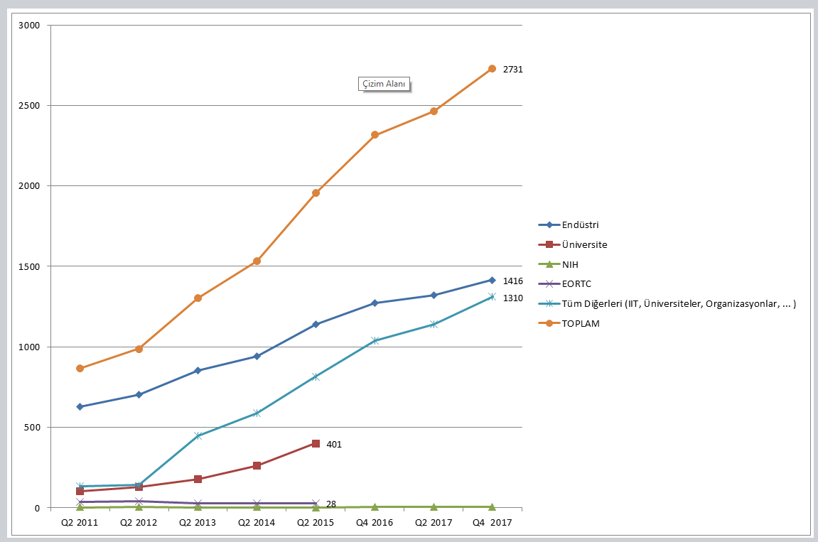 Türkiye'de yapılmış olan tüm çalışmaların (bitmiş ve devam etmekte olan) destekleyicilerine göre dağılımı.