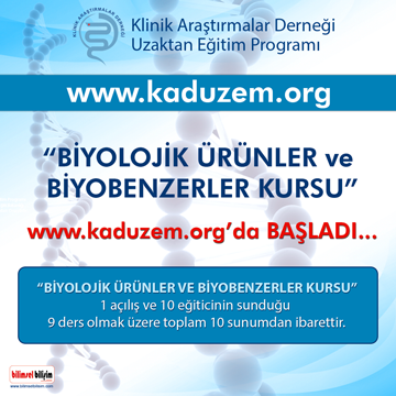 Son yıllarda üzerinde çok şey konuşulan ama az şey bilinen "Biyolojik ajanlar ve Biyobenzerler" konusunda Klinik Araştırmalar Derneği tarafından hazırlanan Uzaktan Eğitim Kursu KADUZEM üzerinde başlıyor..